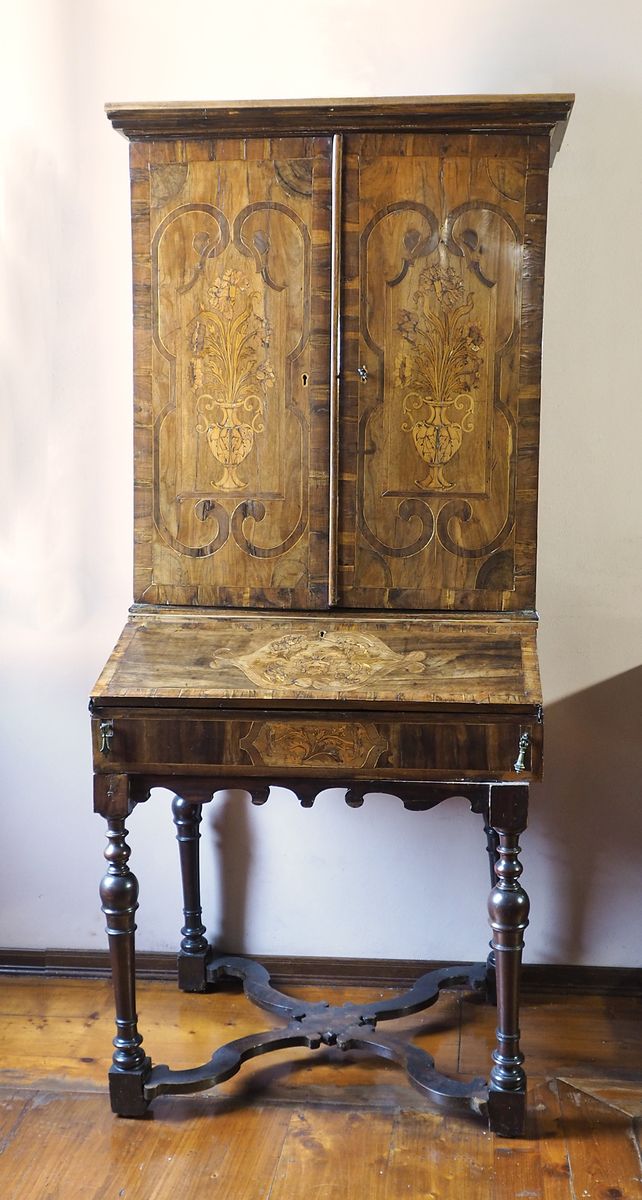 Scrittoio con ribalta e alzata a 2 ante, gambe tornite unite da crociera, specchiature intarsiate a motivi floreali. Veneto, XVIII secolo. cm. 190x80x66.