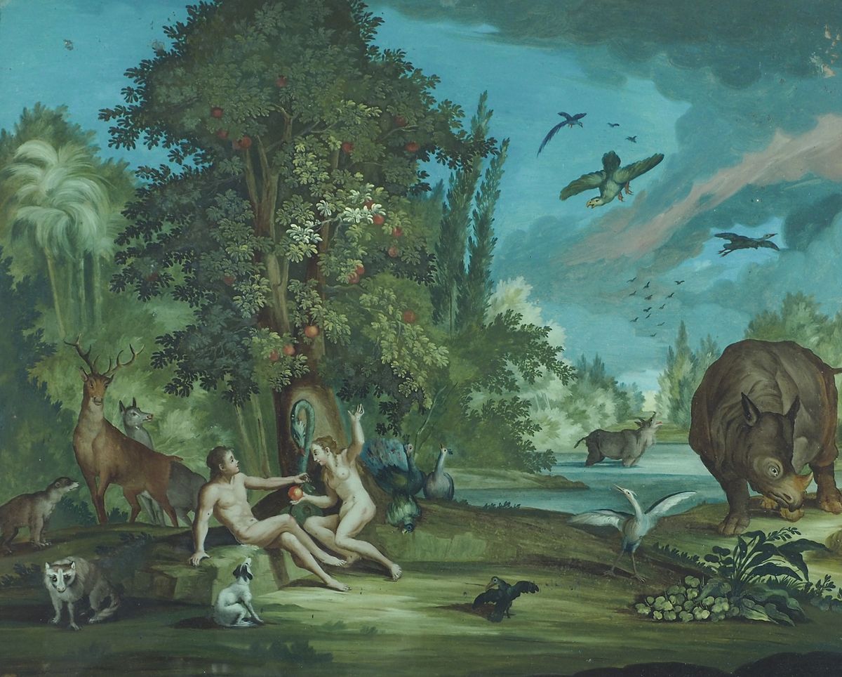 Maestro del XVIII secolo Due dipinti su vetro di cm. 42x52: a) "Adamo ed Eva...