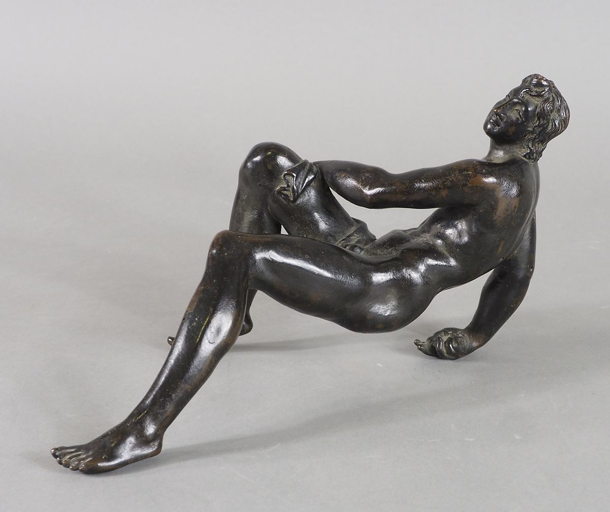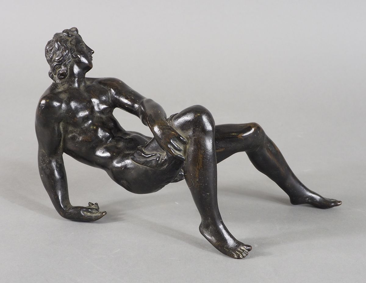 Scultura in bronzo a patina scura raffigurante figura di uomo disteso. XVII secolo. Lung. cm. 30.