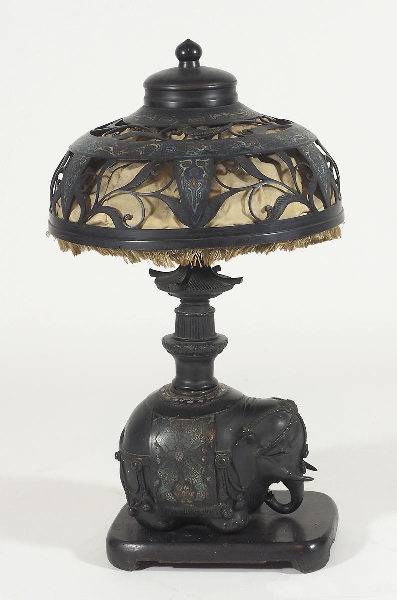 Lampada da tavolo in bronzo a lavorazione cloisonnè con figura di elefante....