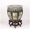 VASO PER PESCI DI FORMA OTTAGONALE Cina In porcellana dipinta in policromia a motivi di figure femminili entro cornici e motivi floreali, poggiante su base in legno Dim. 70x52 cm.
