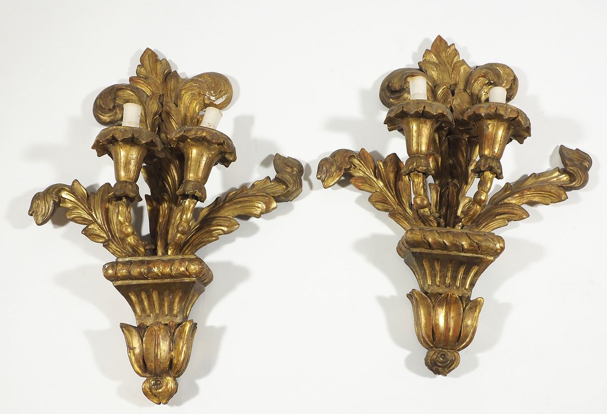 Coppia di antiche appliques in legno dorato a 2 luci finemente scolpite a...