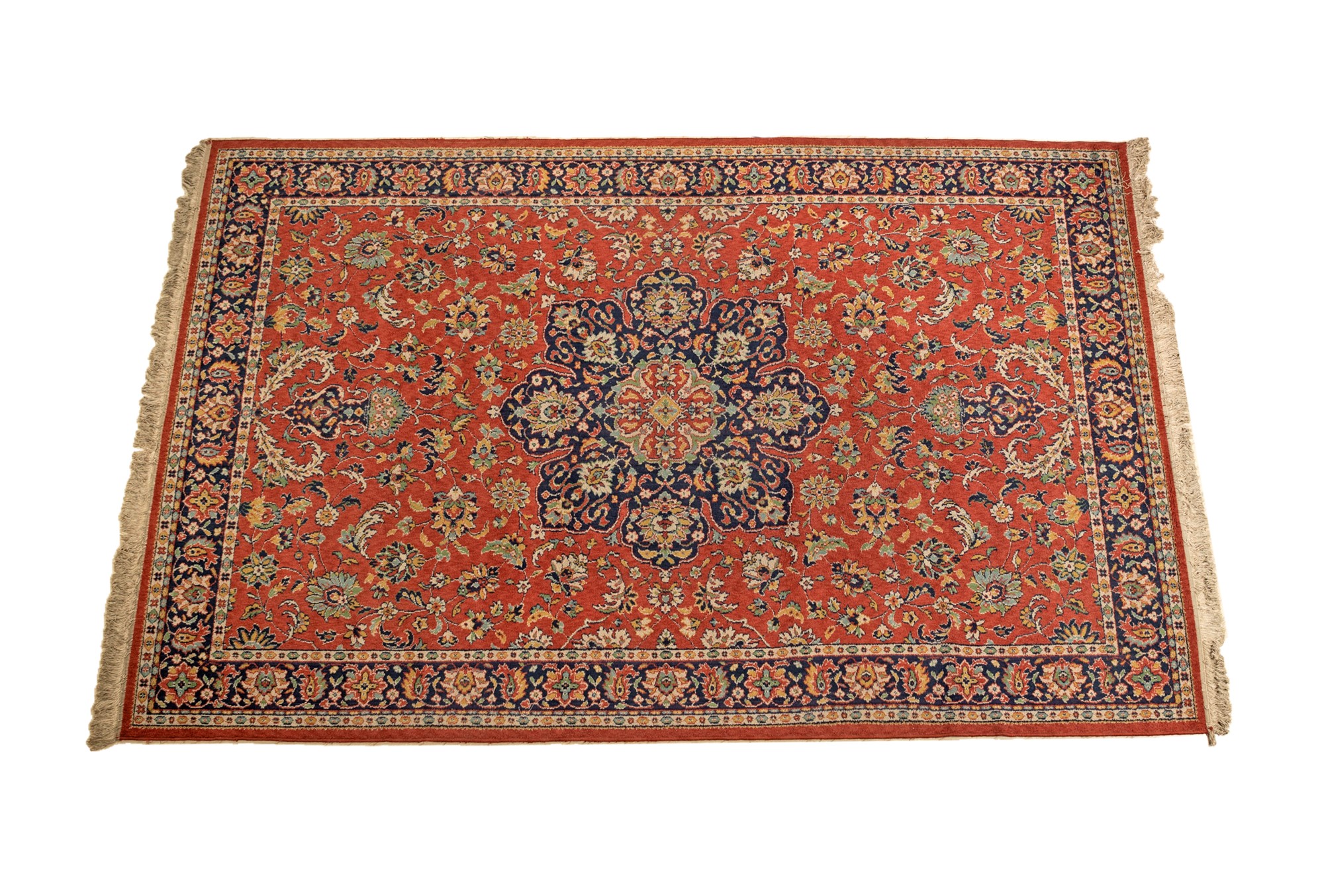 a disegno floreale su campo rosso; medaglione centrale e cornice principale fondo blu. cm 310x200