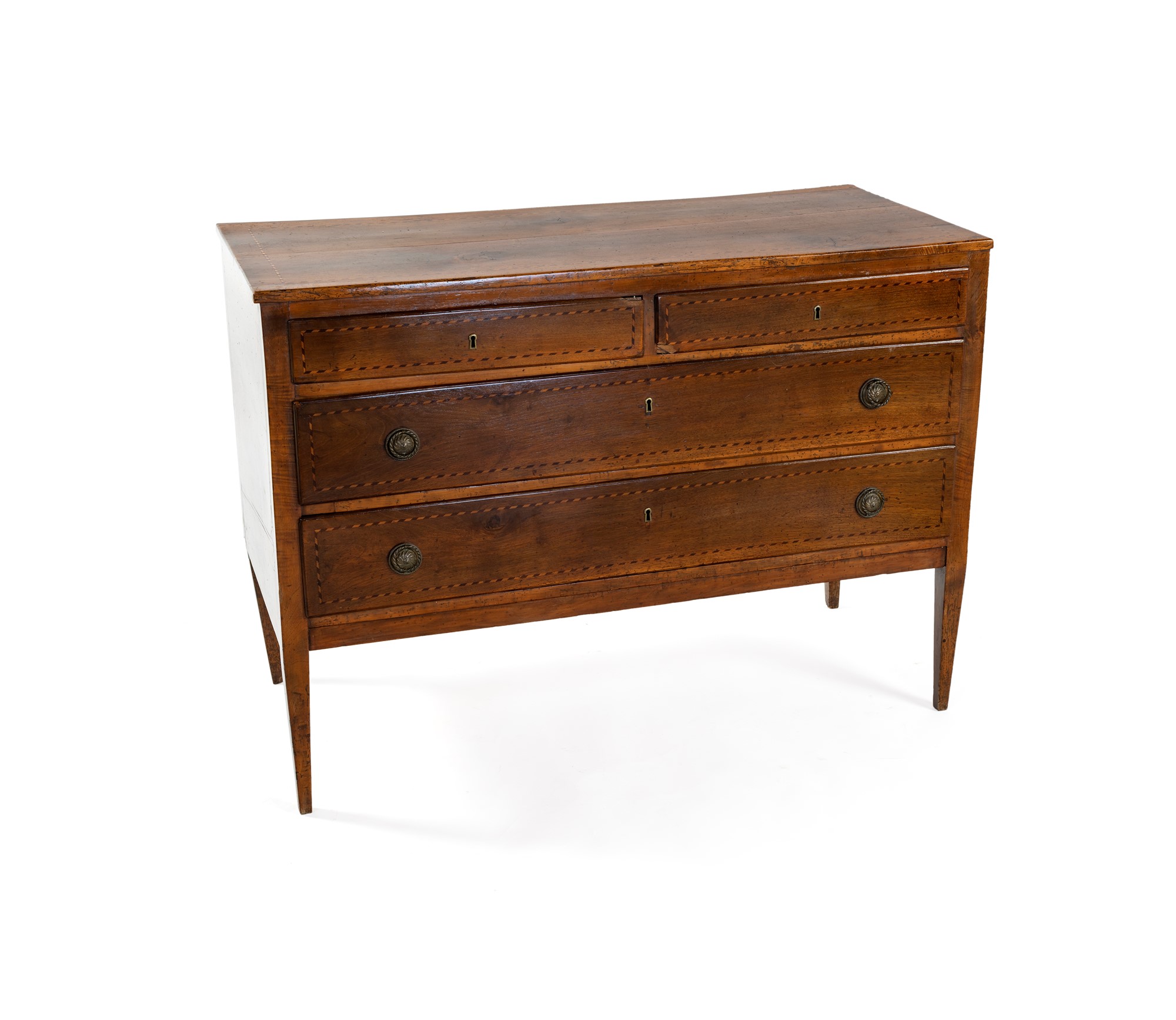 con due cassetti in linea nella fascia e due sottostanti racchiusi da filettatura intarsiata a segmenti diagonali in legni di frutto naturali ed ebanizzati; piedi rastremati. Fine del XVIII secolo. cm 90x124x57