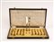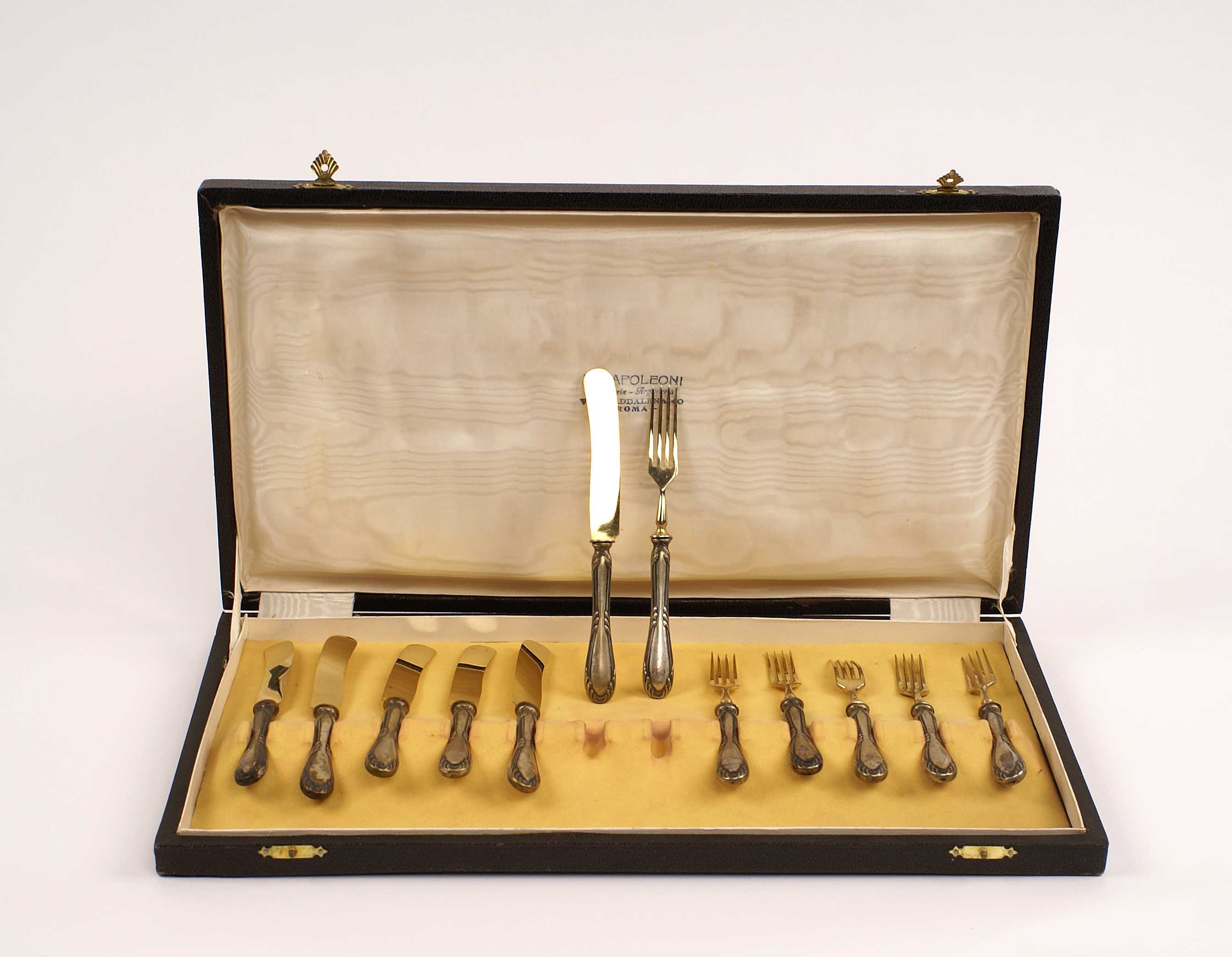 SERVIZIO DI POSATE DA DESSERT primi anni del XX Sec. Con manici in argento, composto da sei forchette e sei coltelli, entro astuccio
