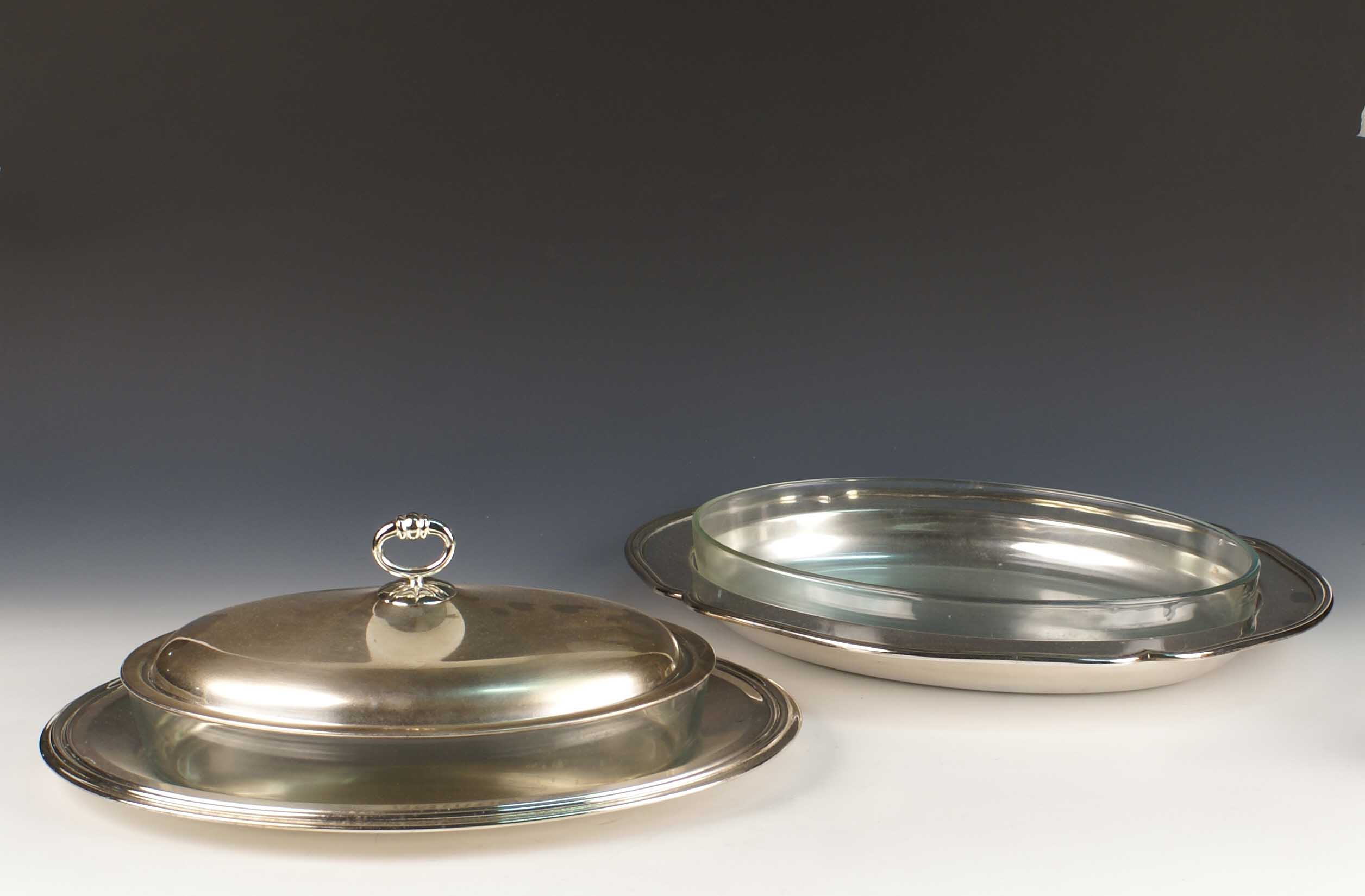 COPPIA DI PIROFILE DA PORTATA In metallo argentato con interni in pyrex, misure diverse