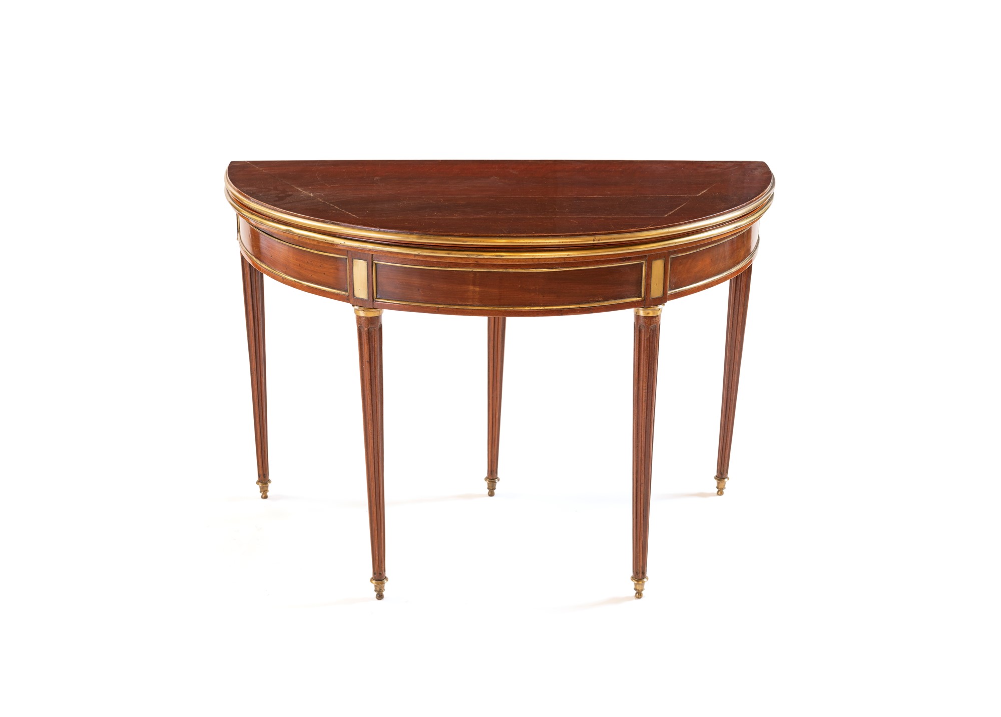 con finiture in metallo dorato; piano a demilune apribile a libretto rivestito all'interno in panno verde; gambe rastremate scanalate. Francia, XIX secolo. Lievi difetti. cm 75,5x108x54