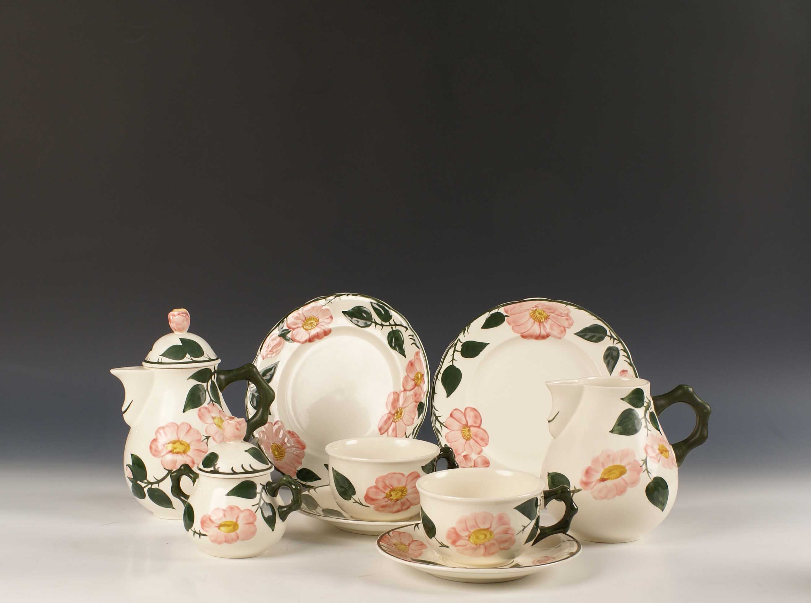 SERVIZIO COLAZIONE TETE A TETE Villaroy & Boch In porcellana bianca e dipinta in policromia a motivi floreali, composto da due tazze, una caffettiera, una lattiera, una zuccheriera e due piatti