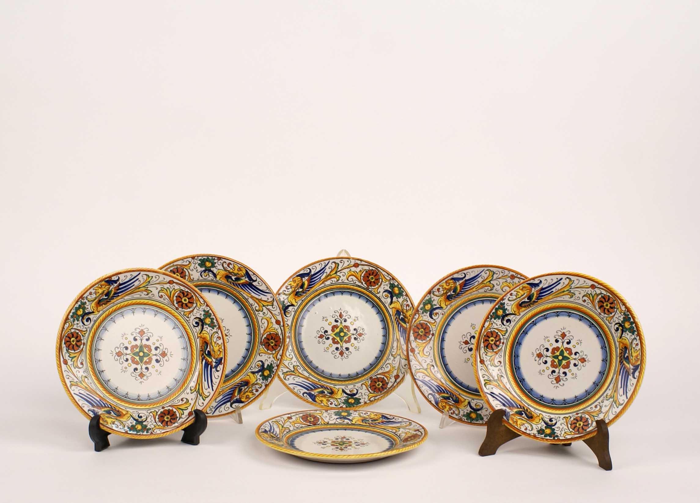 SEI PIATTINI IN CERAMICA Deruta vecchia manifattura Dipinti in policromia D. 19 cm.