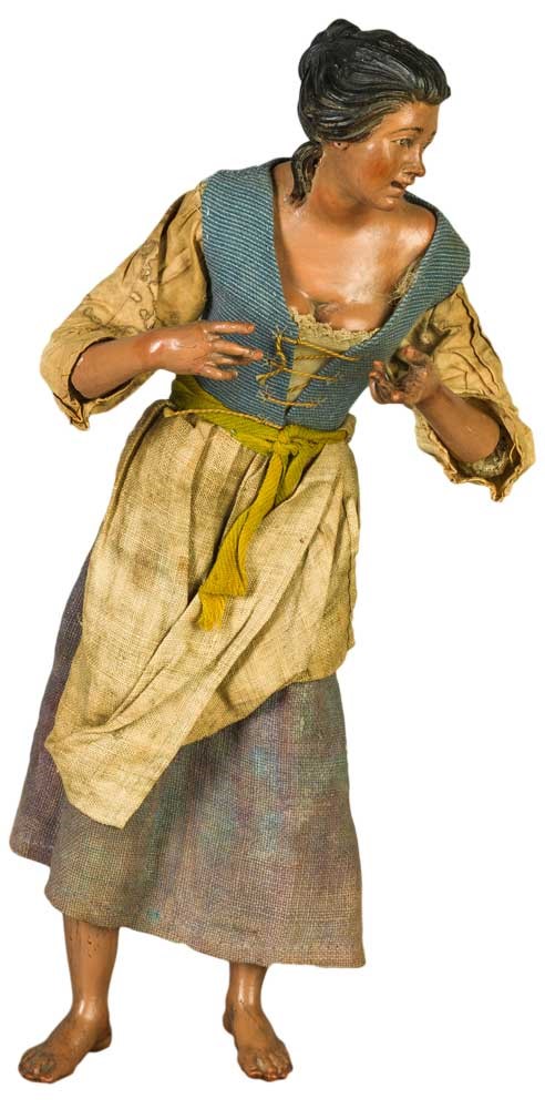 vestitura: camicetta plissettata avorio, cappotto turchese ad evidenziare ampia scollatura, abito grigio, grembiule beige retto da fascia verde, piedi nudi altezza cm 35