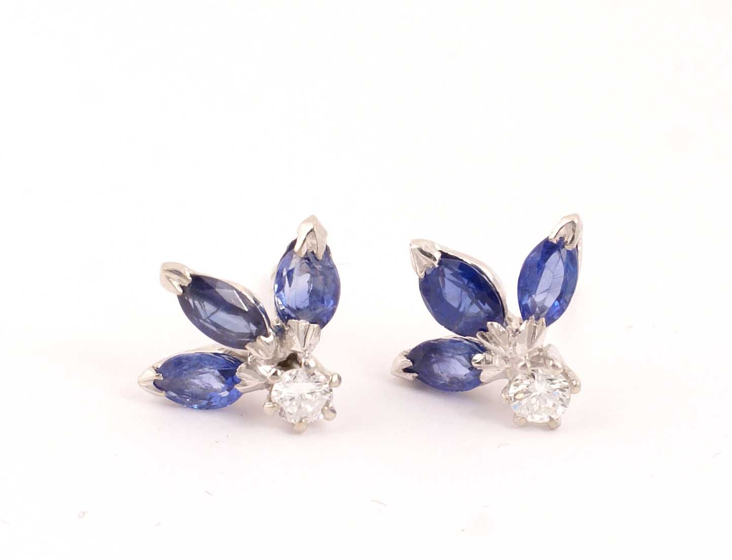 ORECCHINI A MOTIVO FLOREALE IN ORO BIANCO 18KT Con due diamanti taglio brillante e sei zaffiri taglio marquise Peso 3,2 gr.