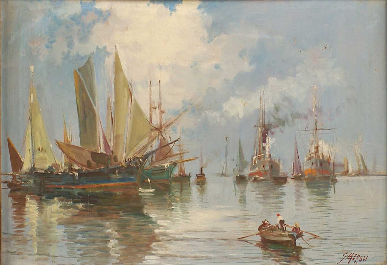G. MEROLI Italia XX Sec. "Marina con barche", olio su compensato, firmato in...