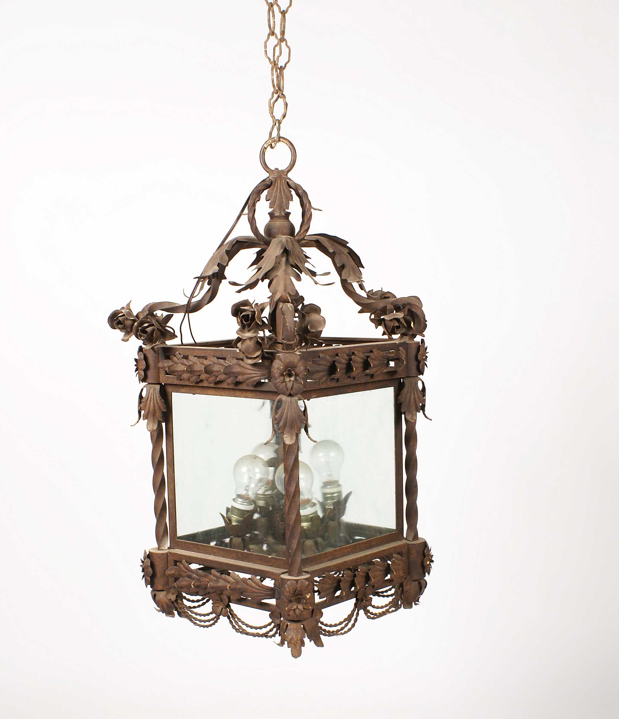 LANTERNA IN FERRO BATTUTO vecchia manifattura Forgiata e decorata a motivo floreale e vegetale H. 76 cm.