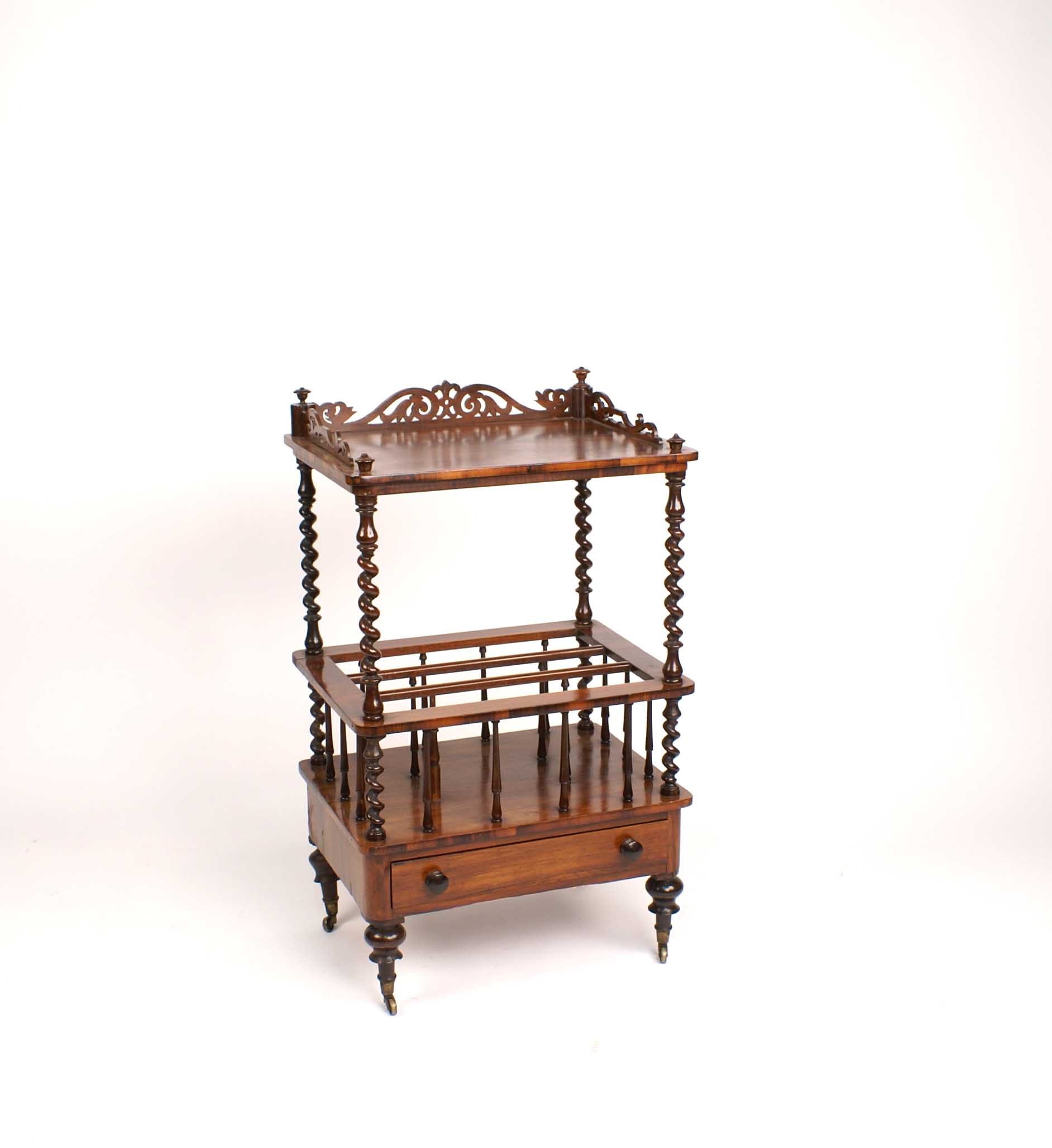 MOBILE PORTARIVISTE Inghilterra XIX Sec. In palissandro a due ripiani delimitati da colonnine tornite con un cassetto sottostante, piedini provvisti di rotelle Dim. 93x55x40 cm.