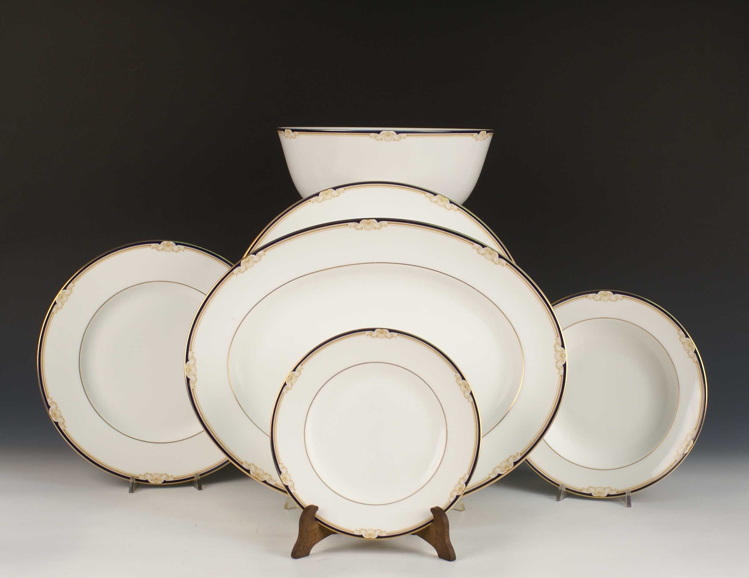SERVIZIO DI 39 PIATTI IN PORCELLANA Wedgwood Inghilterra Modello "Cavendish", composto da 12 piatti piani, 12 piatti fondi, 12 piattini frutta, 2 piatti da portata e 1 insalatiera
