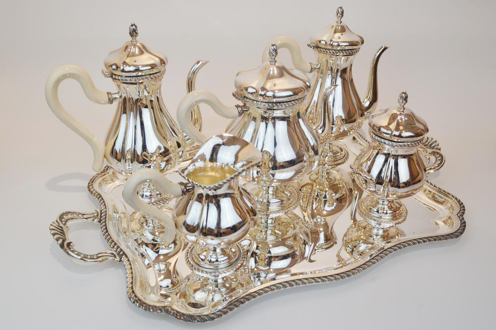 formato da un vassoio con bordo nervato cm 63x40, due caffettiere, una teiera, una lattiera e una zuccheriera