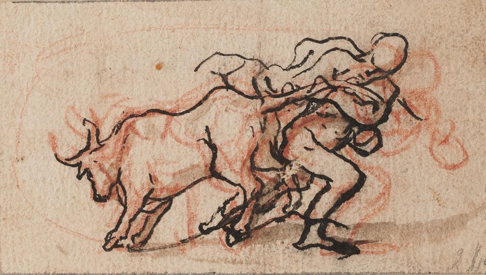 Ercole e il toro di Creta. Penna e inchiostro nero e matita rossa. mm 60x105.