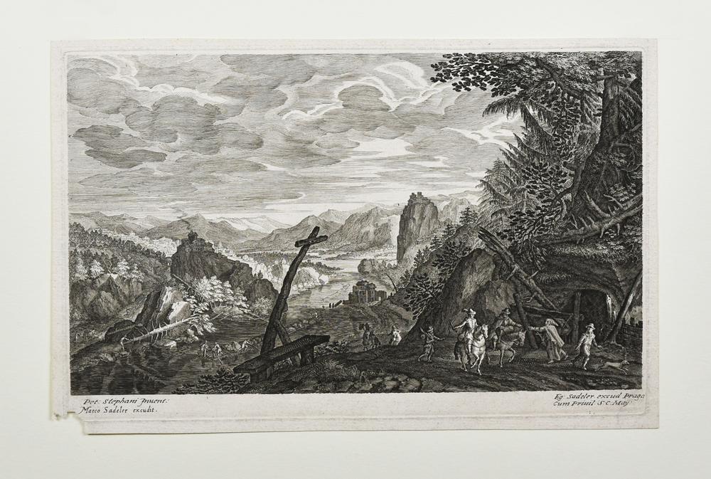 PAESAGGIO FLUVIALE CON CROCE Acquaforte e bulino. mm 21167X251. II stato su 2...