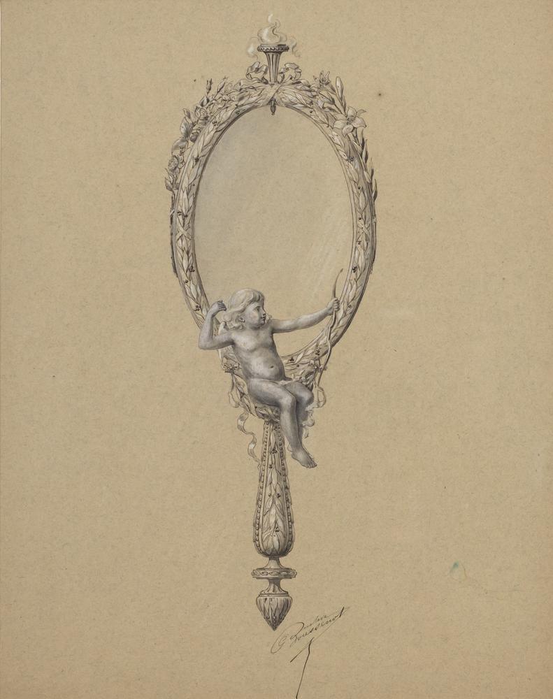 Specchio con putto, inchiostro e tempera su carta, cm 30x39, firmato