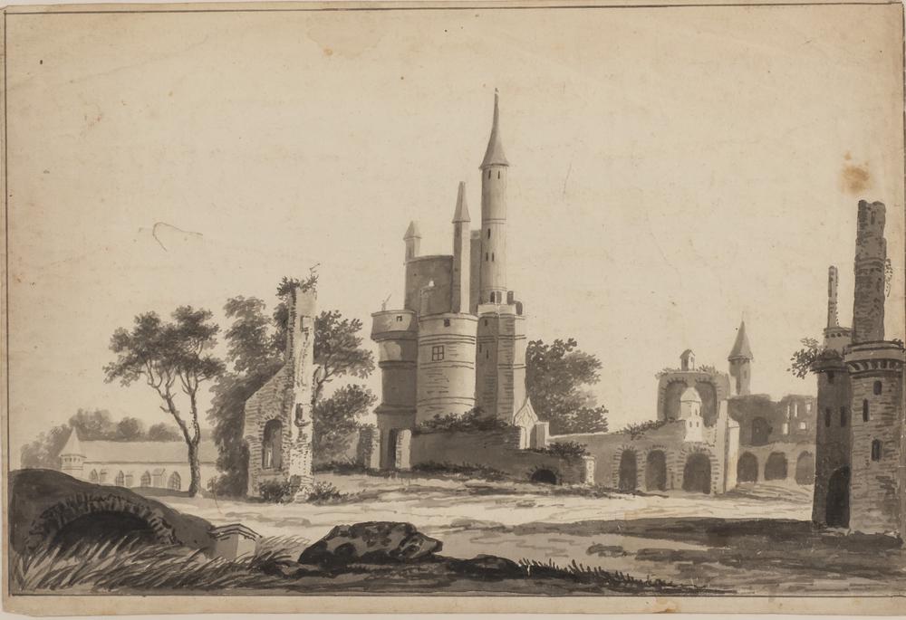 Castello con rovine, acquarello bruno su carta, cm 48x33