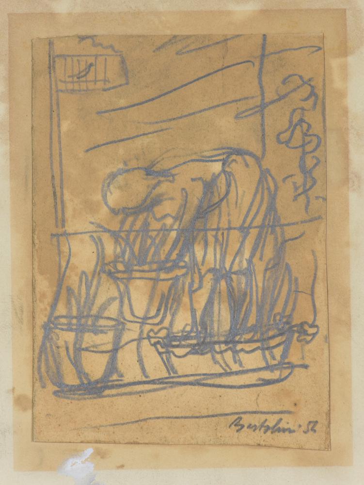 Luigi Bartolini DONNA SUL TERRAZZO Matita nera su carta avana. mm 173x123....