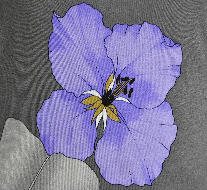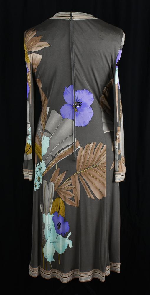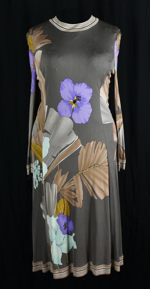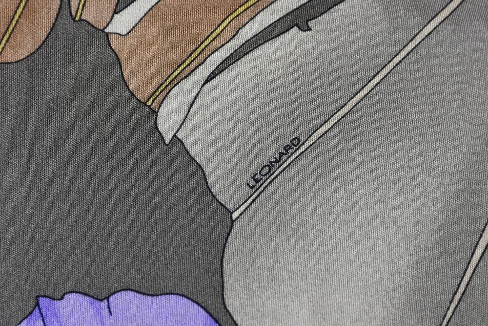 Abito in jersey di seta a stampa floreale nei toni senape ciocco. Lato viola chiaro su base grigio chiaro. Collo arrotondato lunghezza al ginocchio, manca l'etichetta. Stampa in grassetto del marchio Leonard diffuse sull'abito