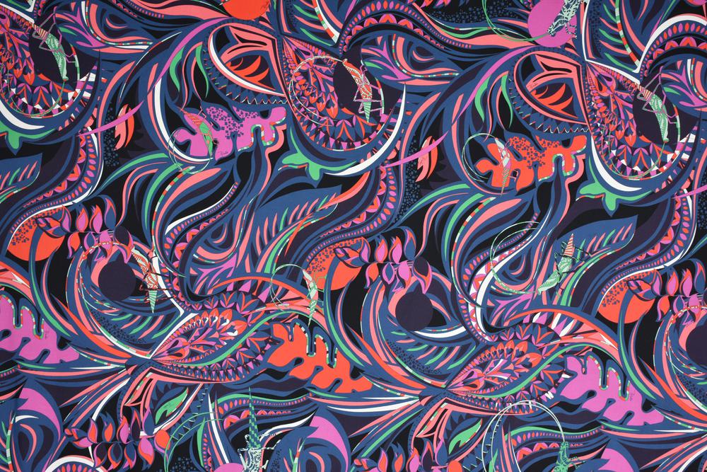Pannello in Jersey di viscosa/elasten. Stampa multicolor disegno savana floreale. Arricchito da cavallette giganti di color verde mai uguali inserite nella flora