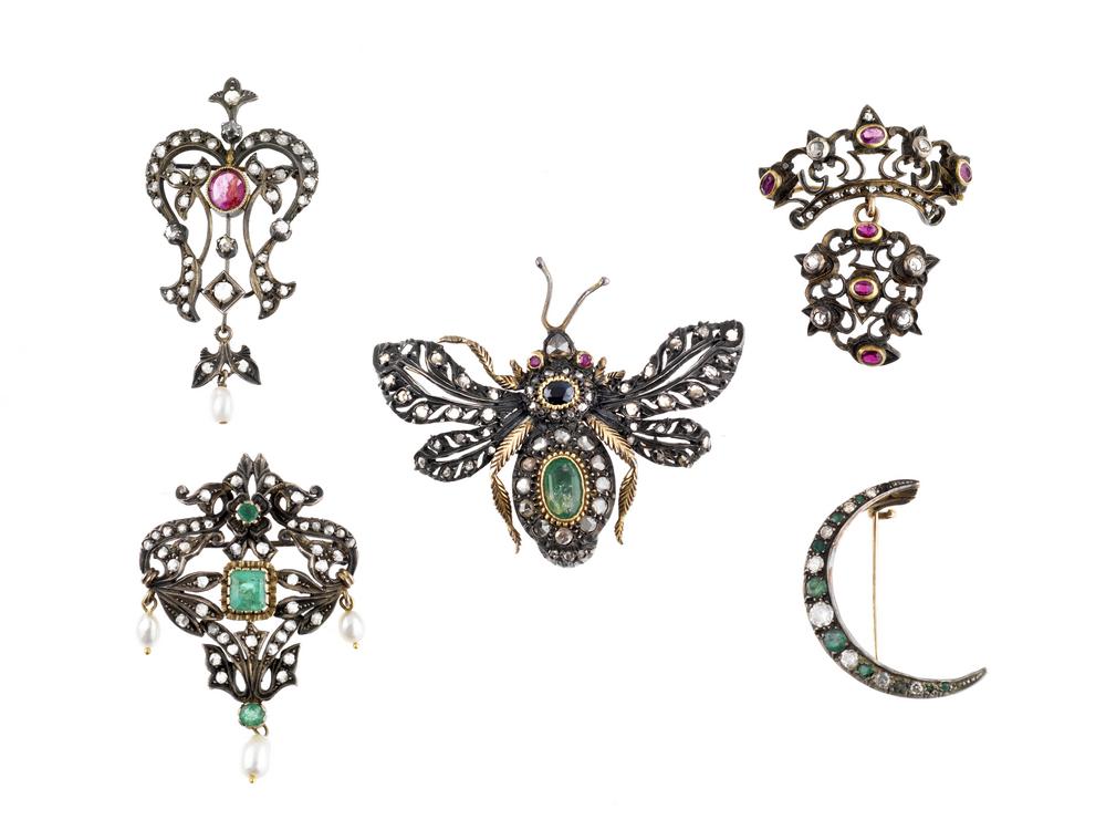 CINQUE SPILLE IN ARGENTO, ORO A BASSO TITOLO, PIETRE DI COLORE, DIAMANTI E PERLE