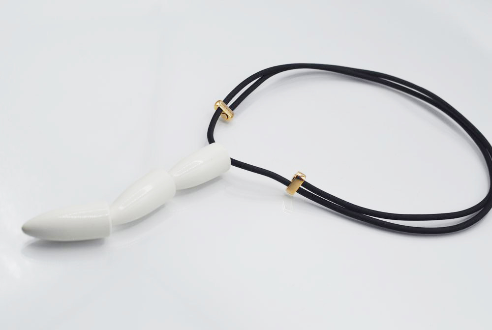 Calla a tre settori conici in Kogolong con raccordi a snodo, girocollo in caucciω nero con interruttori regolabili in oro rosa, gioiello n.265713, punzone 750, lungh. regolabile, g 36