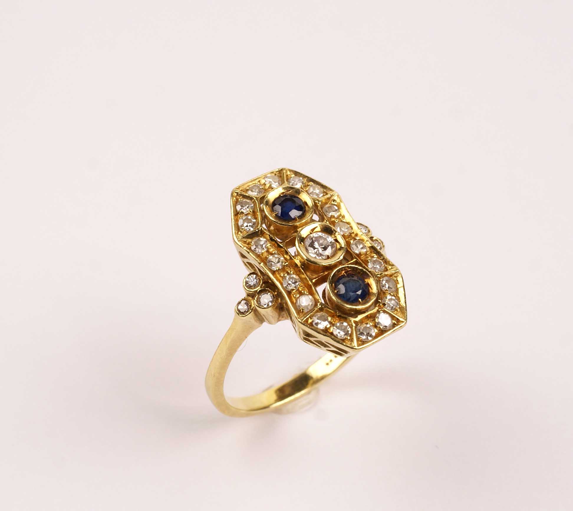 ANELLO A LOSANGA IN ORO GIALLO 18KT Con due zaffiri tondi e diamanti taglio brillante per 0,50 punti circa Peso 6 gr.