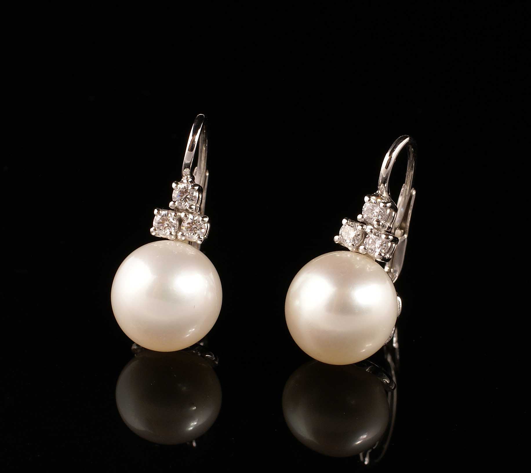 ORECCHINI A MONACHINA IN ORO BIANCO 18KT Con due perle coltivate e diamanti taglio brillante per 0,20 punti circa Peso 6 gr.