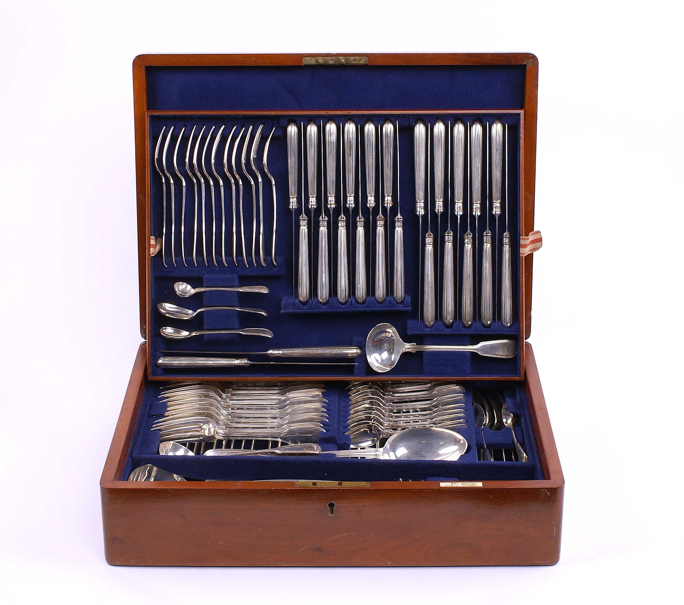 SERVIZIO DI 107 POSATE IN ARGENTO Londra 1840-1850 Composto da 24 forchette, 12 coltelli,12 cucchiai, 12 cucchiai medi, 12 forchette frutta, 12 coltelli frutta, 12 cucchiaini e 11 posate da portata, entro custodia in legno di mogano, epoche e manifatture diverse ma compatibili Peso 6480 gr.