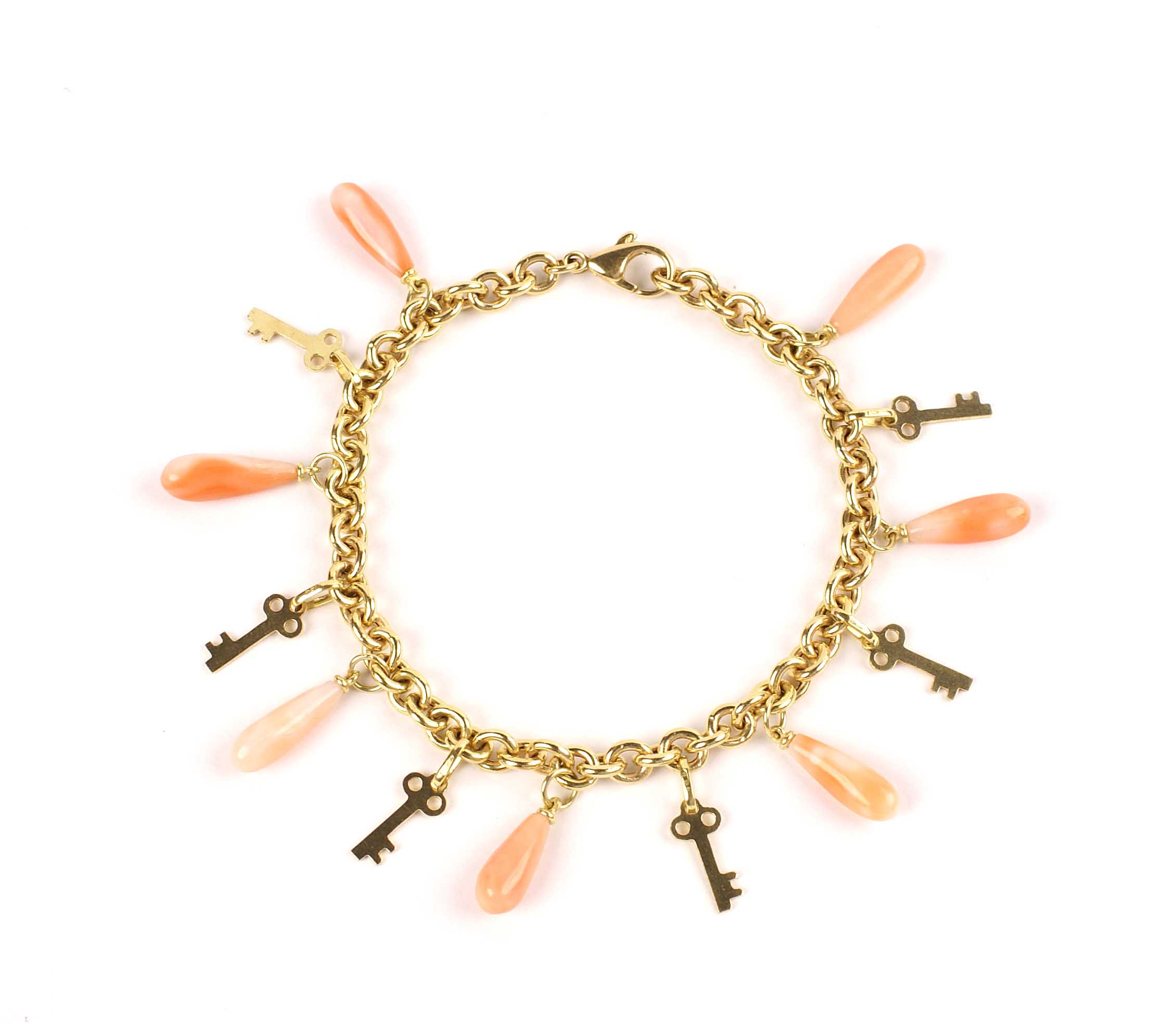 BRACCIALE IN ORO GIALLO 18KT Con sei pendenti in oro a foggia di chiave e sette gocce di corallo Peso 17 gr.