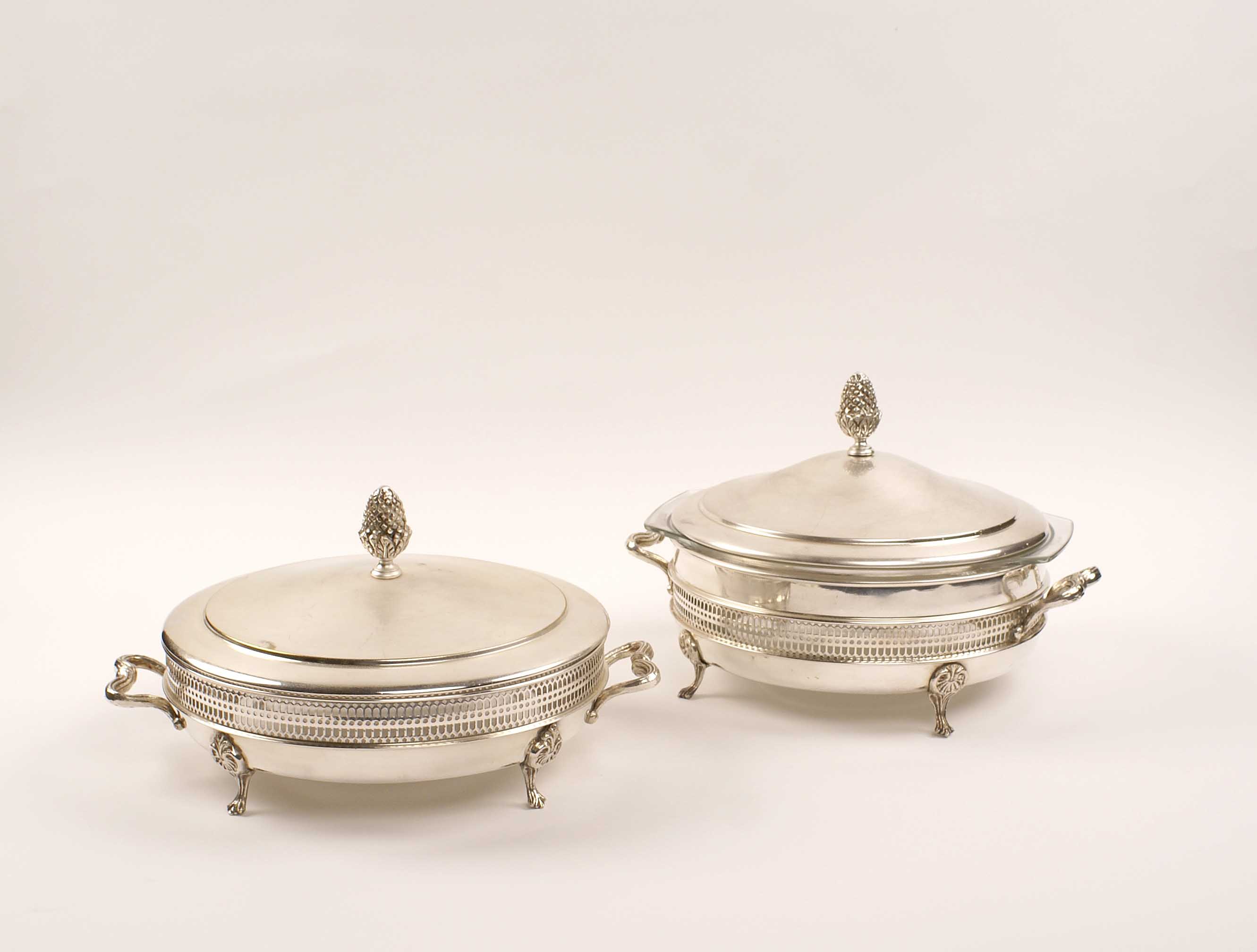 COPPIA DI LEGUMIERE IN METALLO Francia vecchia manifattura Con interni in pyrex e relativi coperchi, misure diverse