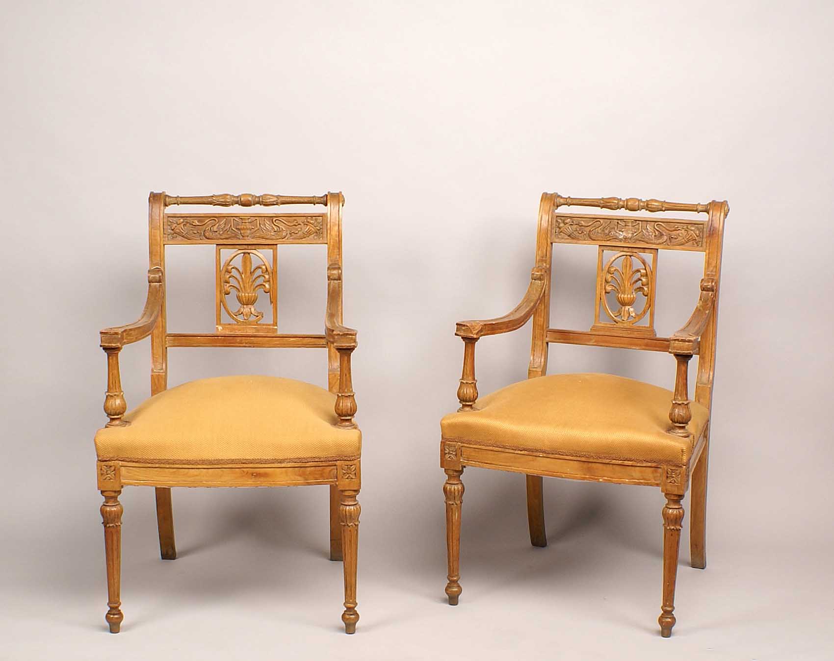 DUE POLTRONCINE IN CILIEGIO INTAGLIATO vecchia manifattura Schienale traforato, seduta imbottita e rivestita in tessuto poggiante su gambe tornite, (difetti e mancanze) H. 92 cm.