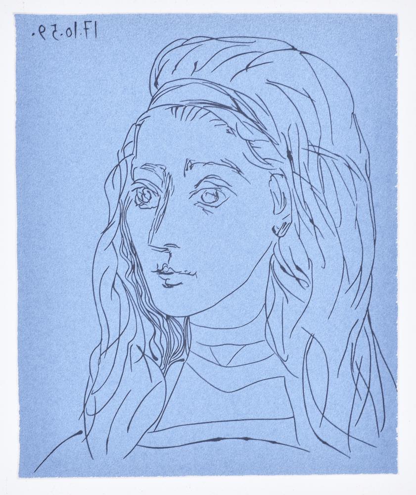 Pablo Picasso JAQUELINE linogravure da disegno originale, cm 31,8x35,5, es....