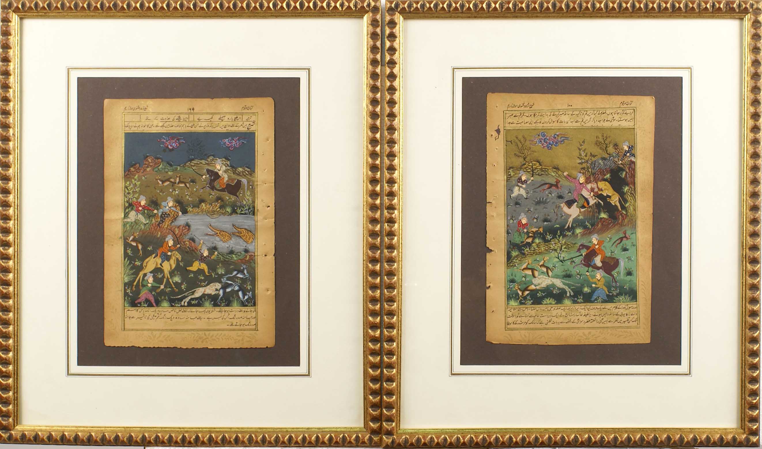 Lotto 356 | SCUOLA PERSIANA XIX Sec. "Scene di caccia", coppia di antiche pagine miniate...