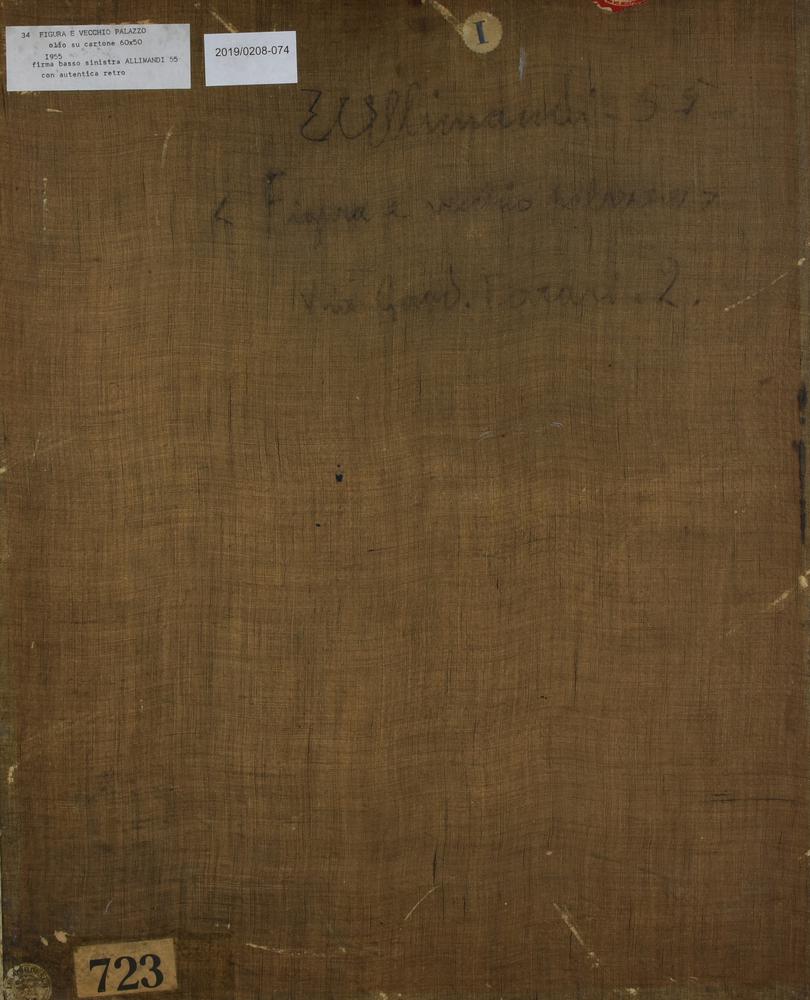 Enrico Allimandi FIGURA E VECCHIO PALAZZO olio su cartone telato, cm 60x50...