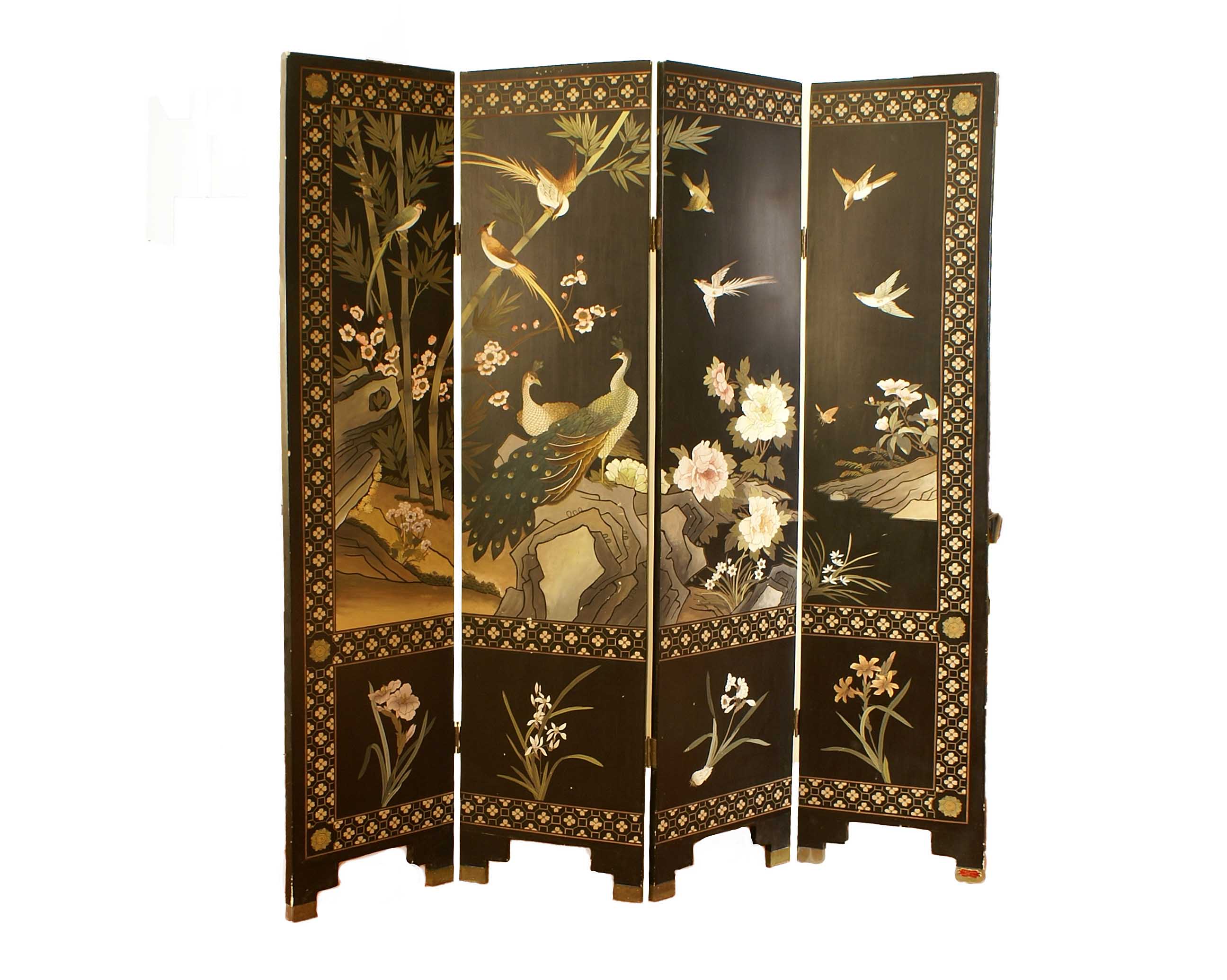 PARAVENTO CINESE Inizi del XX Sec. A quattro ante, in legno a lacca nera con decorazioni in policromia a raffigurare volatili e motivi floreali e vegetali, misure anta, cm. 184x41