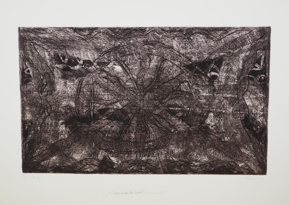 III) A Leonardo (Da Vinci). 1975. Acquaforte e acquatinta. mm 240x416. Foglio: mm 305x495.