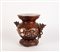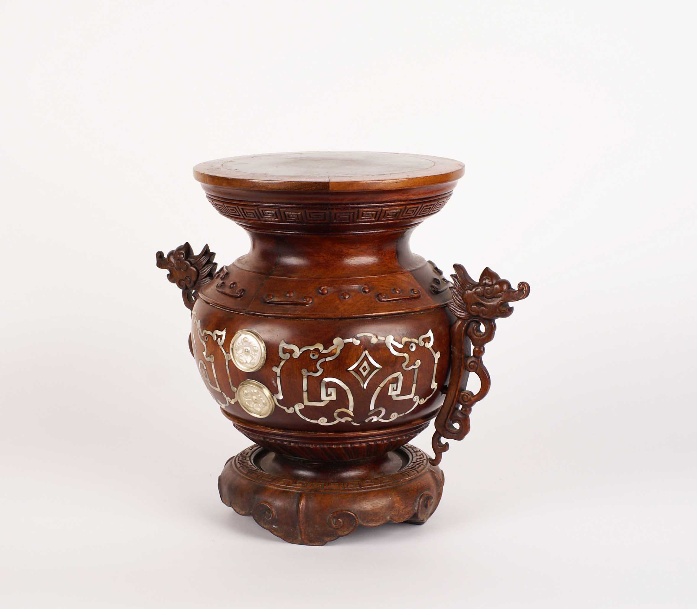 BASE A BOCCIA Cina In legno con intarsi in madreperla a motivi geometrici e decorazioni in metallo, anse a motivi di dragoni, piano circolare in marmo grigio Dim. 25x18 cm.