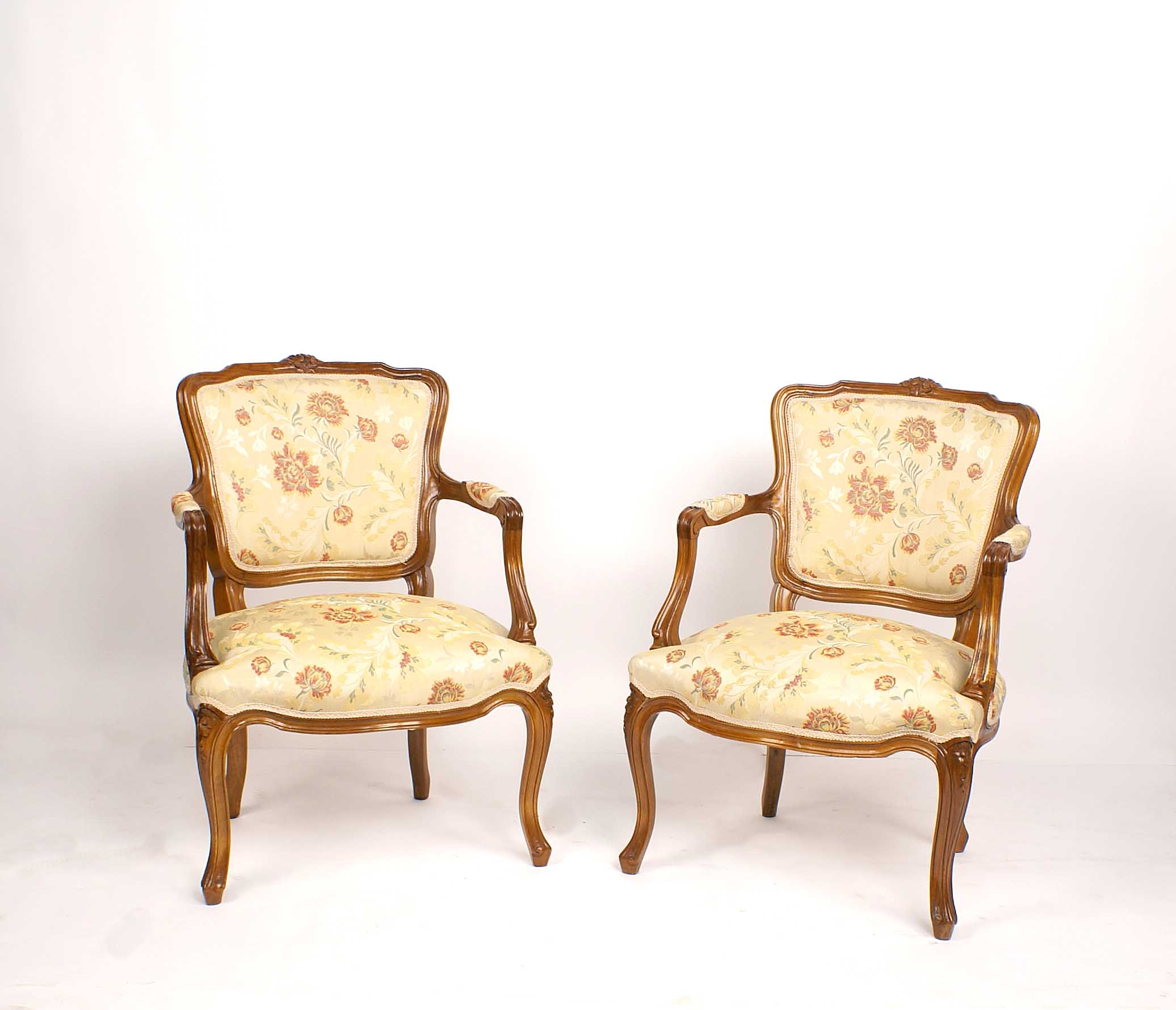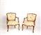 COPPIA DI POLTRONCINE vecchia manifattura In noce intagliata con schienali, sedute e braccioli imbottiti e rivestiti in tessuto H. 82 cm.