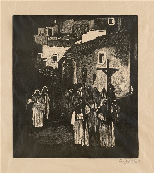 Giuseppe Biasi da Teulada "Processione" litografia (foglio cm 49x40) Firmata i