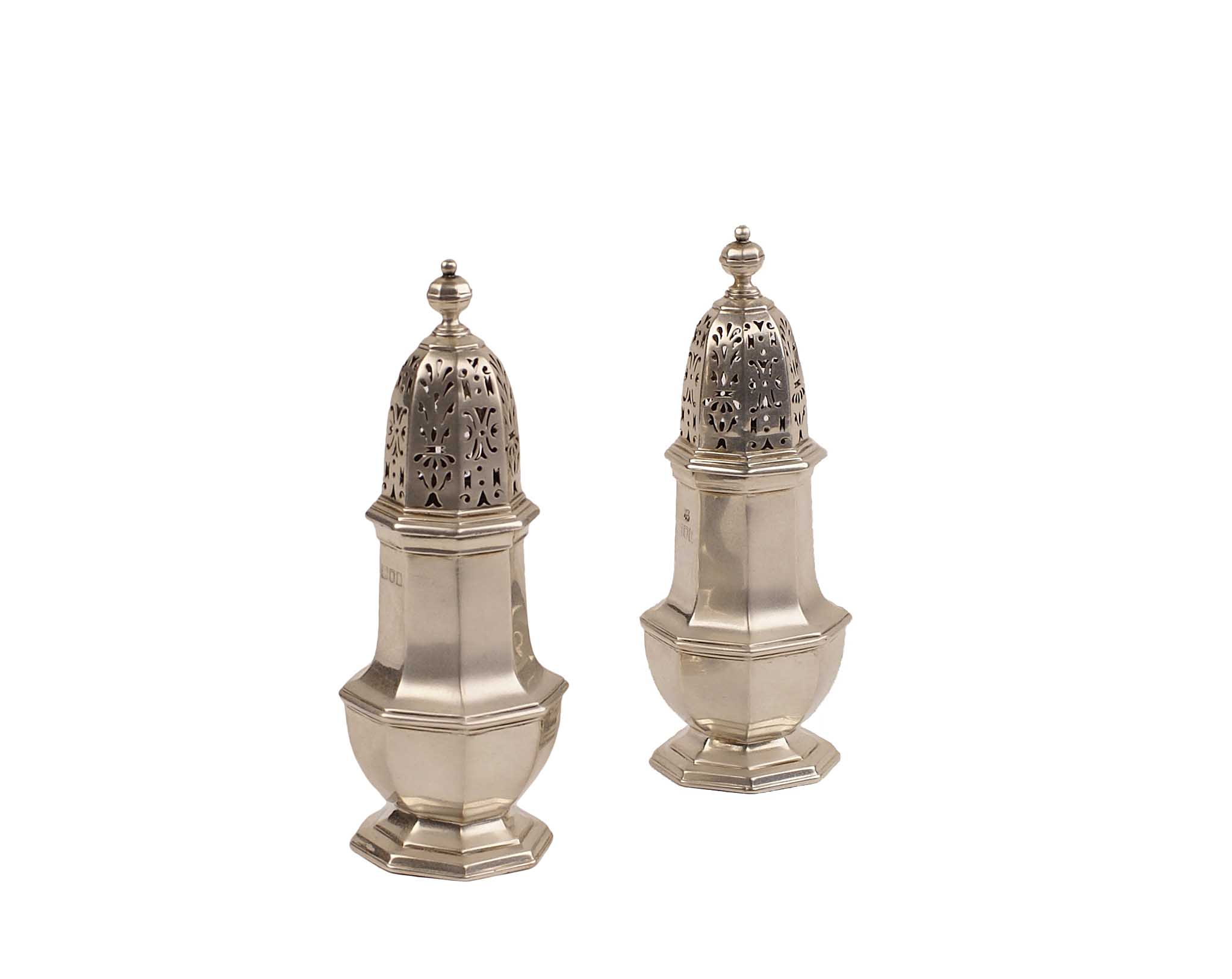COPPIA DI SPARGIZUCCHERO IN ARGENTO Londra 1914 H. cm. 15 Peso 292 gr.