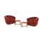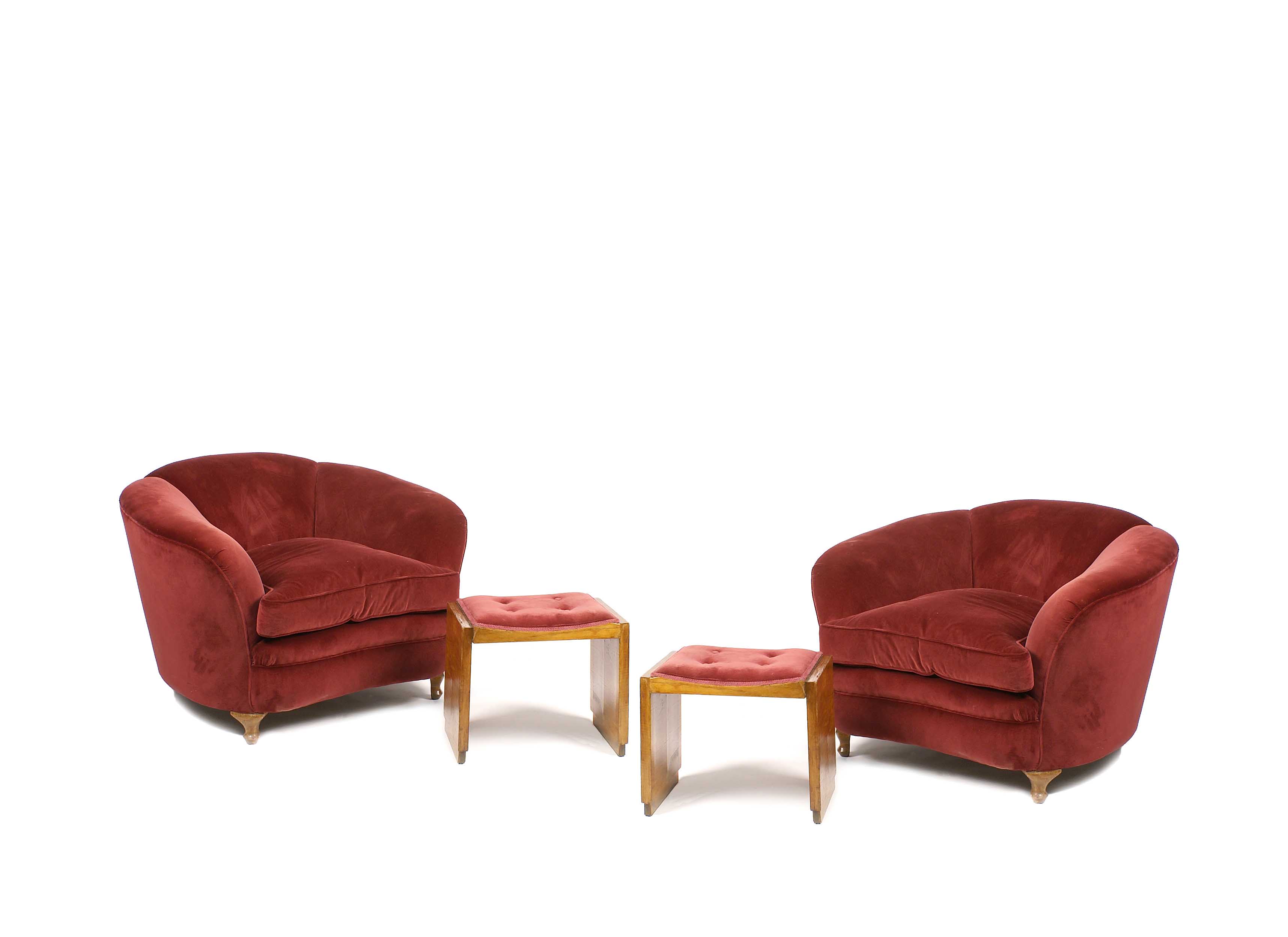 COPPIA DI POLTRONE anni 30/40 Interamente imbottite e rivestite in tessuto poggianti su quattro piedini in noce, con due poggiapiedi in noce e tessuto, cm. 40x46x33 Dim. 74x106x90 cm.