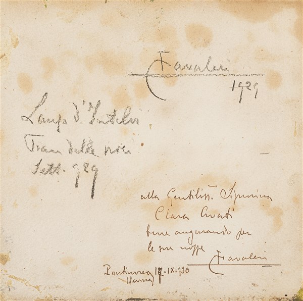 Firmato, dedicato e datato "Alla signora Clara Avati bene augurando" in basso a destra