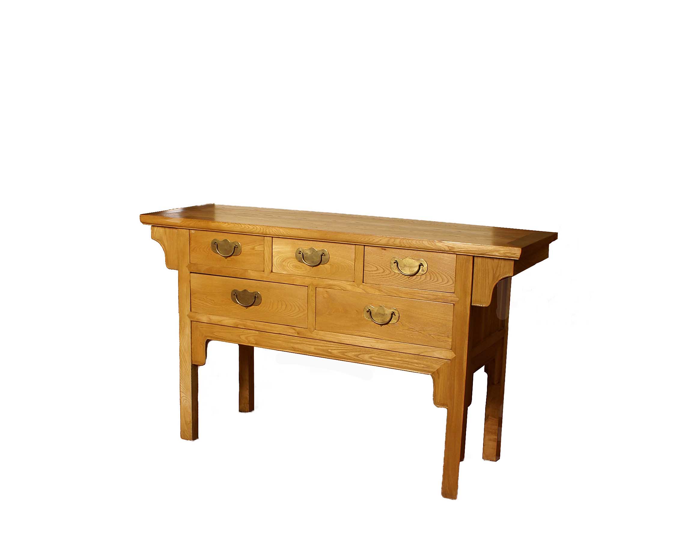 MOBILE CONSOLE manifattura cinese In legno di frassino, piano rettangolare con fronte a cinque cassetti, gambe di linea squadrata Dim. 80x135x42,5 cm.