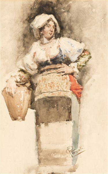 Gaetano Previati "Acquaiola" acquerello su cartoncino (cm 35x23) Firmato in bas