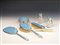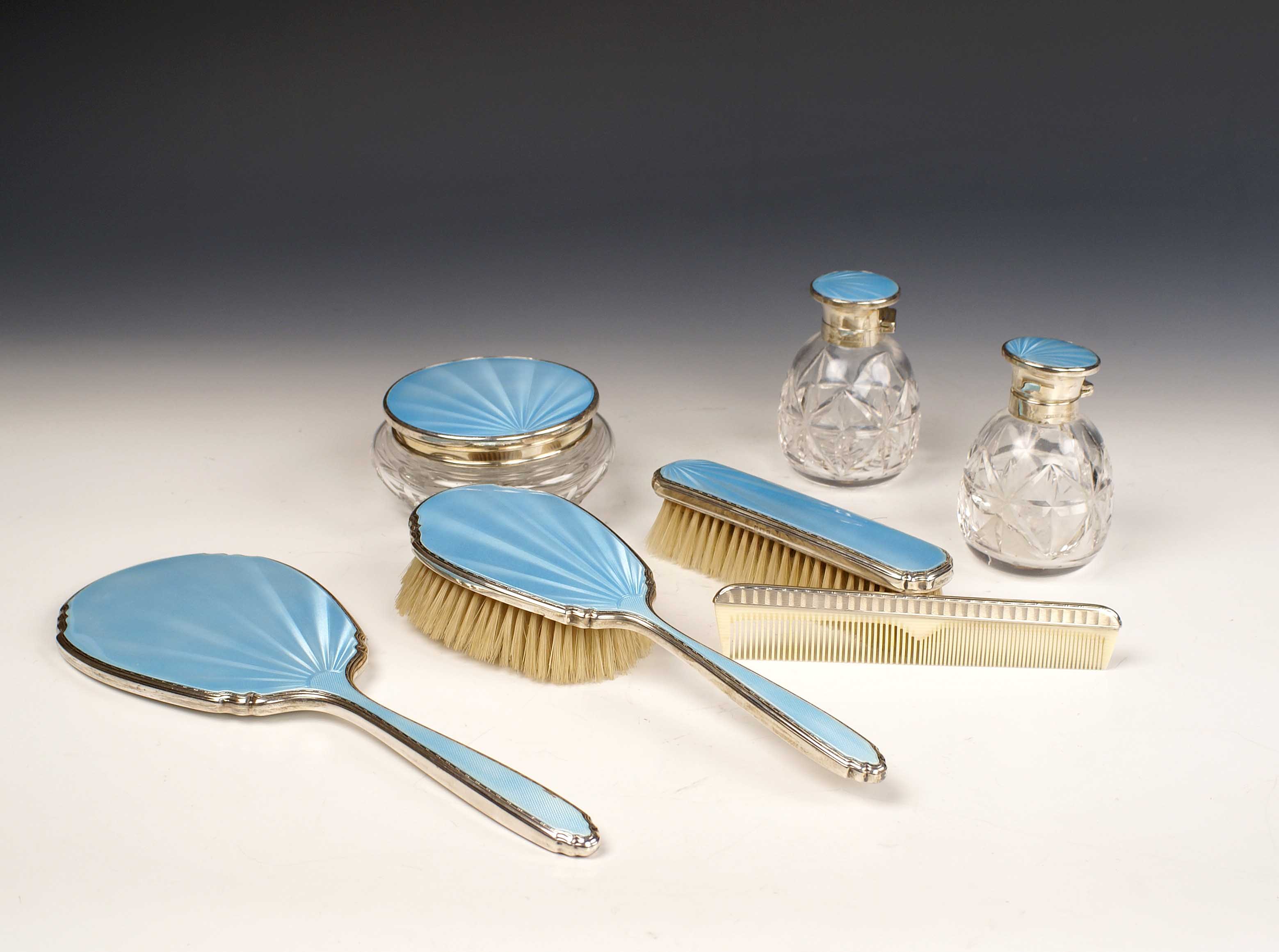 SERVIZIO DA TOLETTA 7 PEZZI Birmingham 1961-1964 In argento, smalto guilloche celeste e cristallo molato, composto da 1 specchio, 2 spazzole, 1 pettine,2 flaconi e 1 scatola, (difetti)