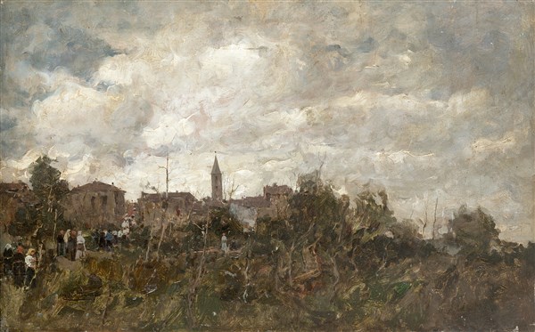 Angelo Dall'Oca Bianca "La processione" olio su tela (cm 36,5x58) Firmato in ba